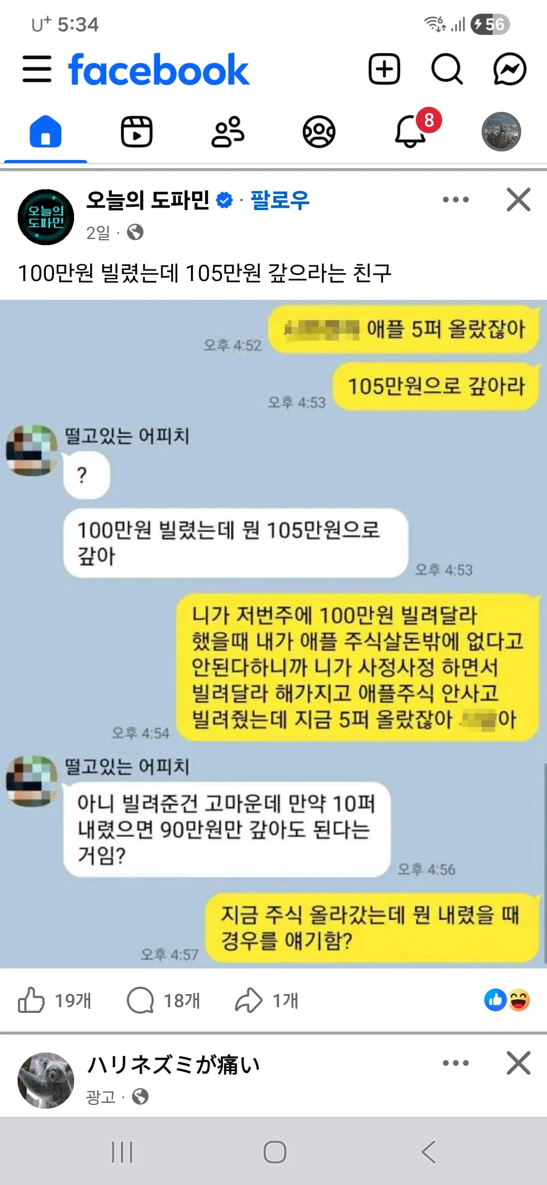 100만원 빌렸는데 105만원 갚으라는 친구 > 유머게시판