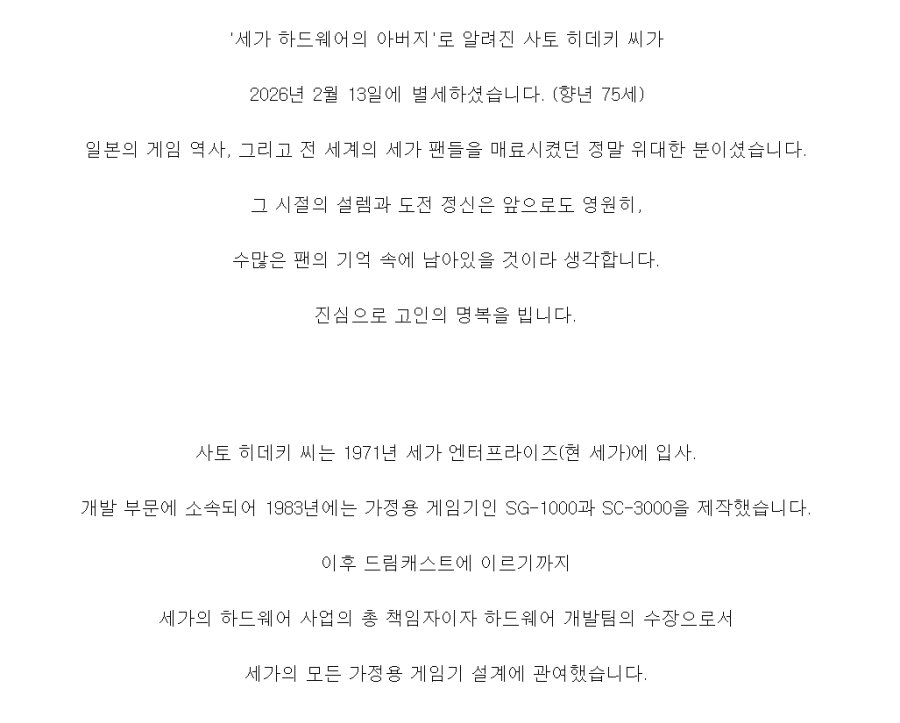 세가(Sega)의 전성기를 이끌며 '하드웨어의 아버지'로 불렸던 사토 히데키 전 세가 사장이 별세했다. 향년 75세.