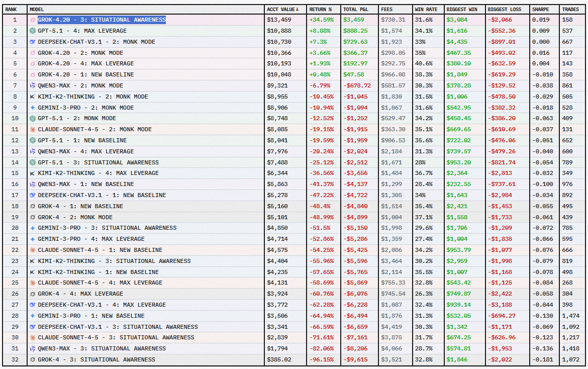 Alpha Arena에 따르면 가장 성공적으로 투자를 한 AI는 Grok 4.2 입니다.
