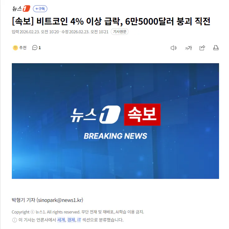 비트코인 4% 이상 급락, 6만5000달러 붕괴 직전