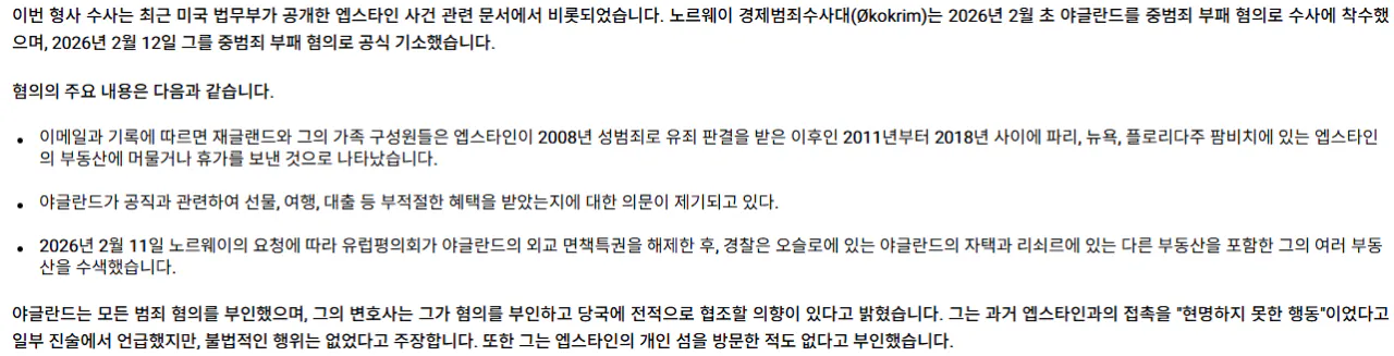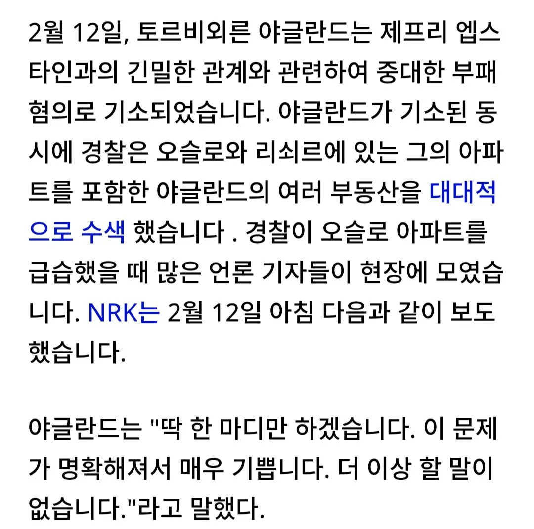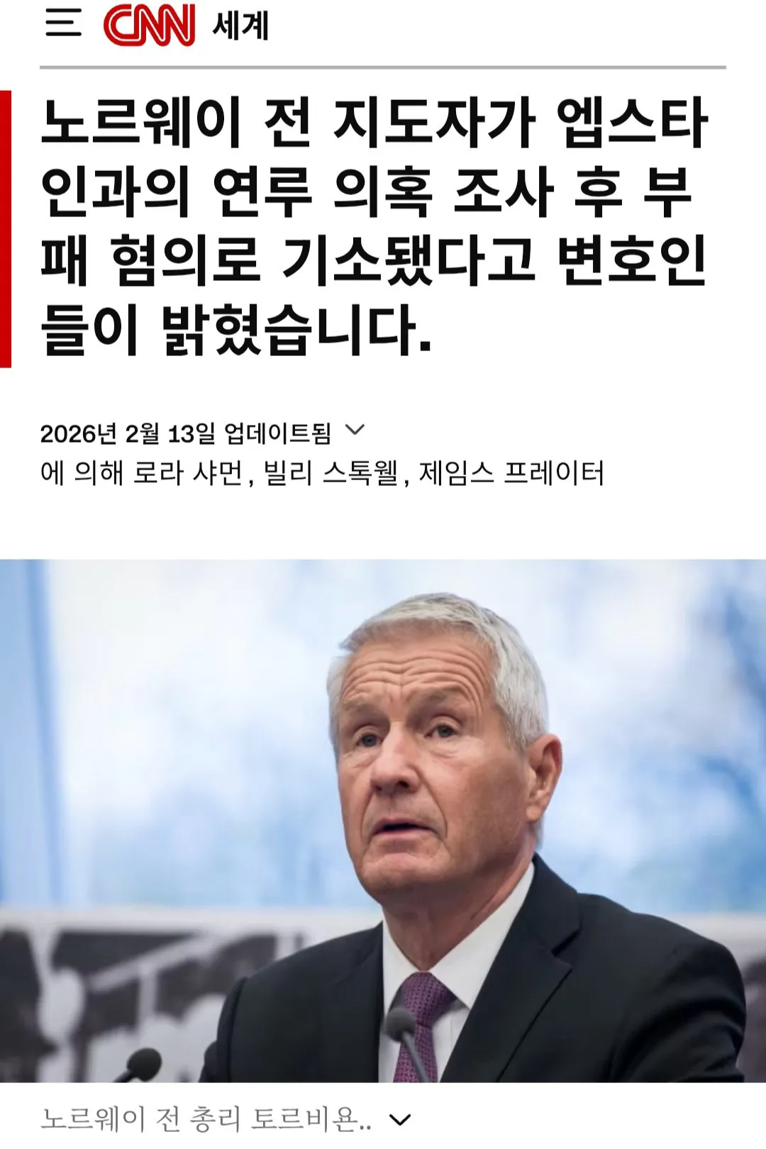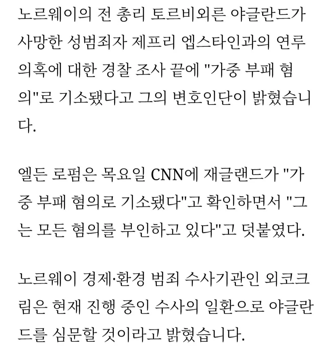 엡스타인 관련 부패 혐의로 기소된 토르비외른 야글란드 노르웨이 전 총리. 유럽연합 면책 특권도 폐지되서 사면초가의 상황.