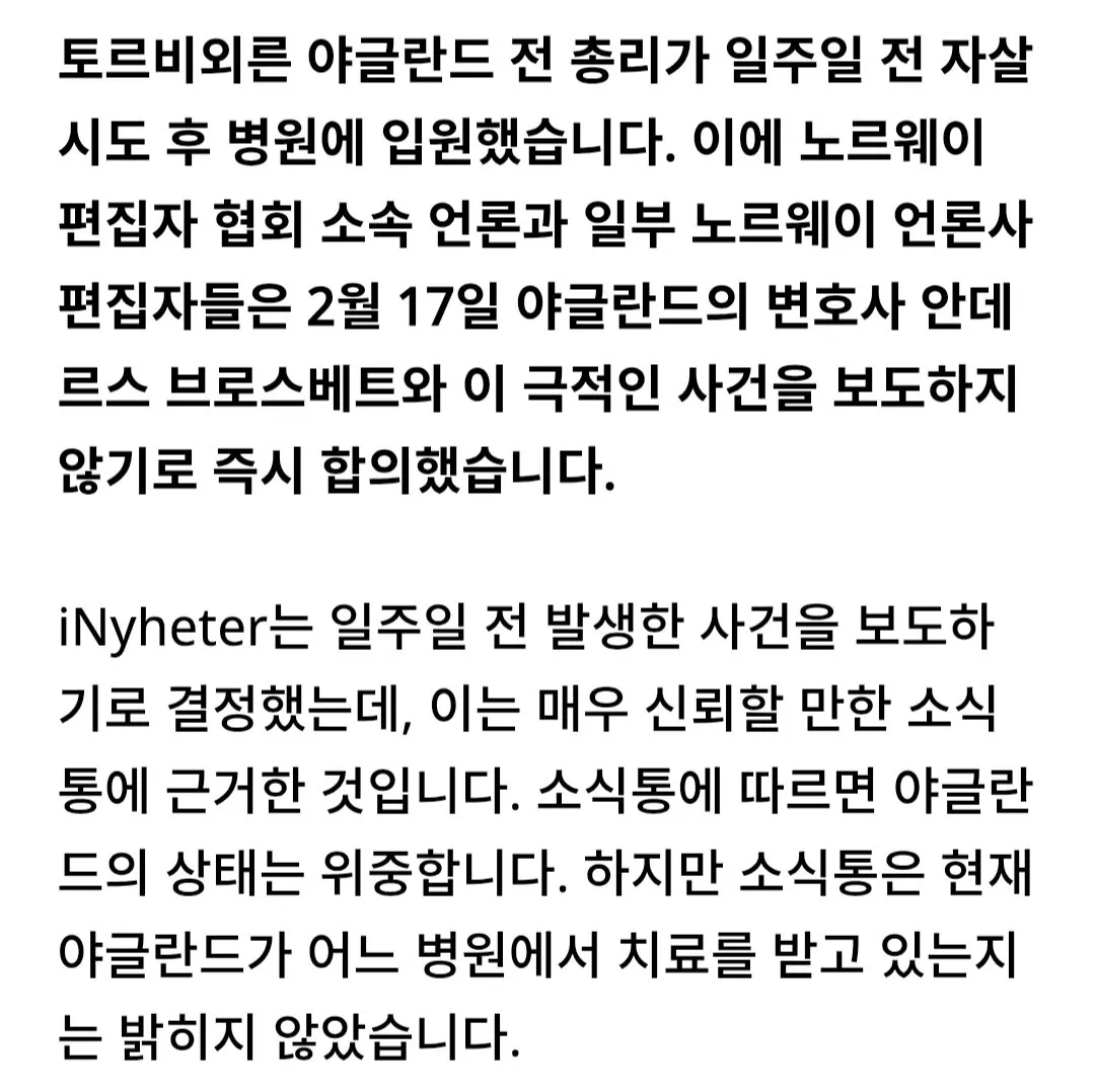 노르웨이 언론에 따르면 일주일전에 자살시도로 입원. 위독하다고 함