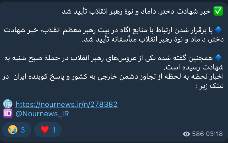 하메네이 친딸, 손주, 며느리, 사위 사망확인